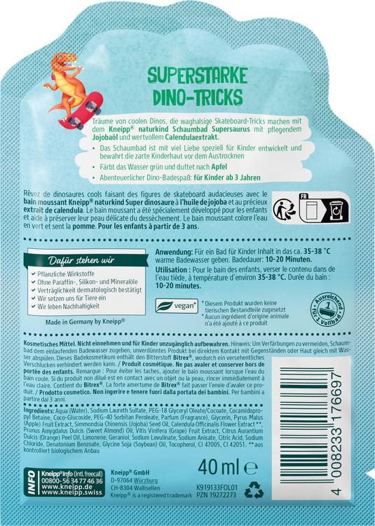 Kneipp naturkind Supersaurus bubbelbad förvandlar badandet till en spännande upplevelse för små äventyrare från 3 år och uppåt. Med en underbar äppeldoft och ett långvarigt, rikt skum ger det massor av badglädje. Den specialutvecklade formulan är skonsam mot barns känsliga hud och skyddar deras naturliga hudbarriär, samtidigt som badvattnet lyser i en livfull grön färg. Berikad med närande jojobaolja och värdefullt ringblommeextrakt skyddar den barns känsliga hud från att torka ut och ger en lugnande badupplevelse. Helt fri från fotogener, silikoner och mikroplaster är den här produkten det perfekta valet för en bekymmersfri badupplevelse.