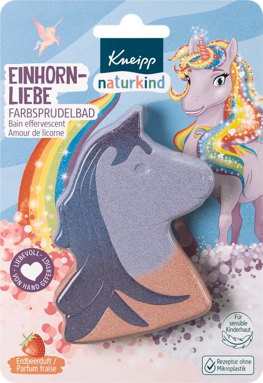 Upplev magiska badstunder med Kneipp® naturkind färgskumbad Unicorn Love. Denna bubblande badtillsats är speciellt utvecklad för barns känsliga hud och förvandlar vattnet till en magisk rosa färg och omsluter badrummet med en söt jordgubbsdoft. De värdefulla ingredienserna, såsom druvkärne- och avokadoolja, ser till att huden inte torkar ut och vårdas varsamt. Lägg bara badbomben i vattnet och det färgglada skummet utvecklas - riktigt badskoj för barn från 3 år och uppåt, vilket gör badet till en oförglömlig upplevelse. Formulan är fri från mikroplaster och garanterar ett bekymmersfritt bad.