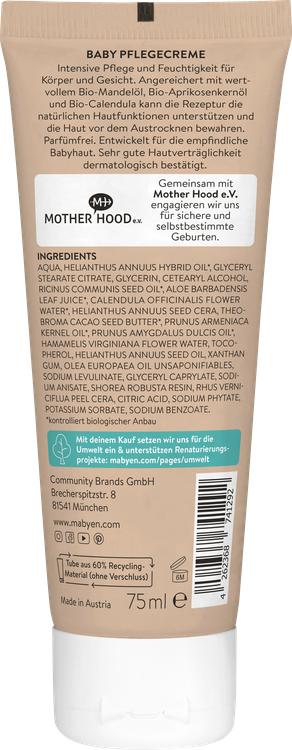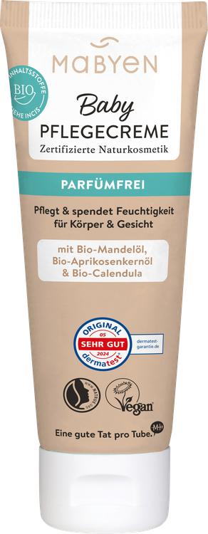 Mabyen Baby Care Cream erbjuder intensiv fuktgivande vård för spädbarns känsliga hud. Dess speciella formula kombinerar värdefulla ekologiska ingredienser som mandelolja, aprikoskärnolja och ringblomma, som är kända för sina närande och skyddande egenskaper. Denna kräm är idealisk för daglig användning för att förhindra att barnets känsliga hud torkar ut och för att hålla den smidig och frisk. Tack vare den dermatologiskt bekräftade hudkompatibiliteten är den perfekt för nyfödda barns behov. Den veganska formuleringen är också doftfri och behaglig på huden, vilket gör den till ett skonsamt val för ansikts- och kroppsvård.