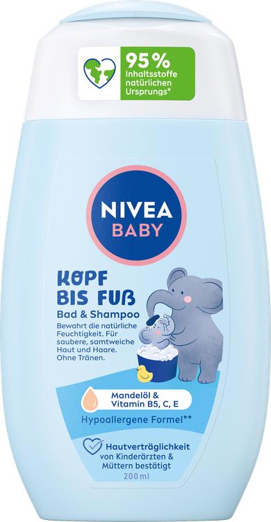 Nivea BABY Head to Toe Bath & Shampoo erbjuder skonsam och mild rengöring för ditt barns känsliga hud och hår. Berikad med 100% naturlig mandelolja och värdefulla vitaminer B5, C och E, säkerställer den inte bara noggrann rengöring utan skyddar också mot uttorkning. Den allergivänliga formulan har utvecklats speciellt för spädbarns behov och har testats av barnläkare och mödrar för hudkompatibilitet. Det unika doftkomplexet SleepEssence™ hjälper ditt barn att slappna av och förbereder det varsamt för sömn. Den veganska och biologiskt nedbrytbara formulan är fri från animaliska ingredienser, mikroplaster, mineralolja och parabener, så att du kan känna dig helt trygg när du tar hand om ditt lilla barn. Upptäck en avkopplande kvällsritual utan tårar med Nivea BABY.