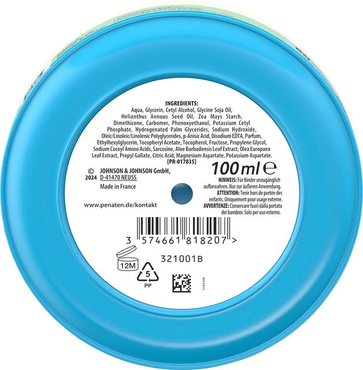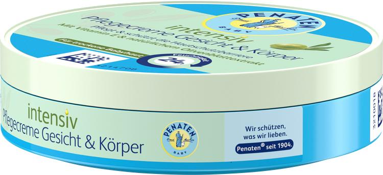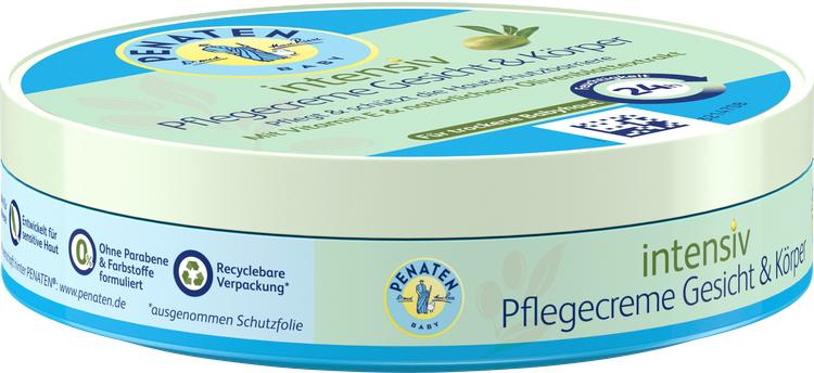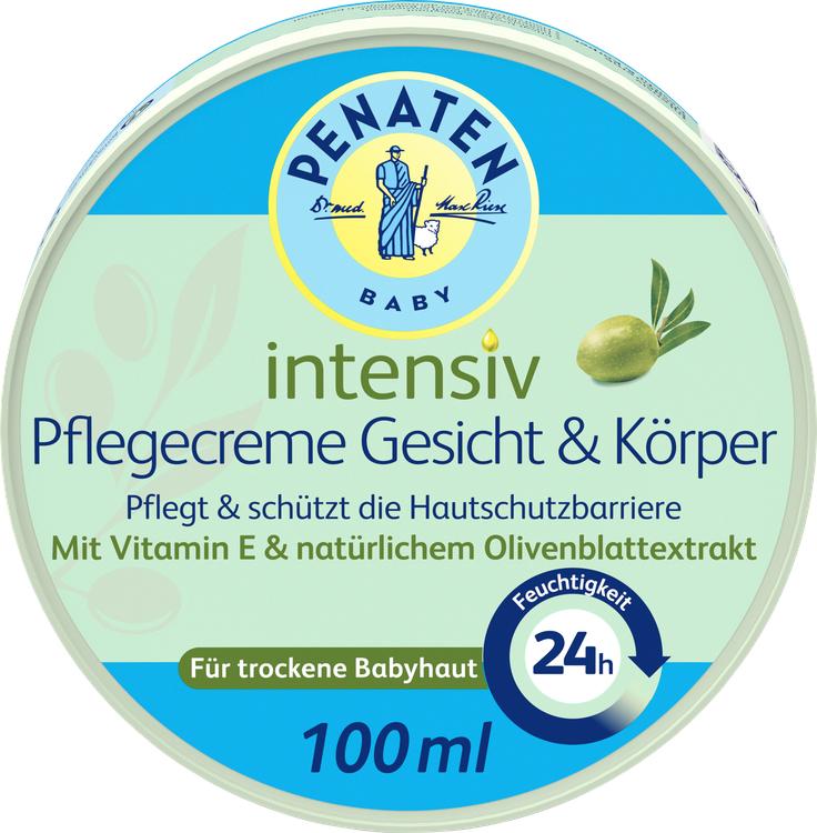 Penaten Baby Care Cream Face & Body Intensive är en vårdkräm speciellt utvecklad för den känsliga huden hos nyfödda barn. Den ger en intensiv, skyddande och fuktgivande vård som absorberas snabbt och är idealisk för torr babyhud. Krämen är berikad med värdefullt E-vitamin och naturligt olivbladsextrakt som stödjer hudens skyddsbarriär och ger en mjuk och skyddad hud. Denna mångsidiga kräm kan användas både i ansiktet och på kroppen och ger ett viktigt fuktskydd i 24 timmar. Den är dermatologiskt testad och skonsam mot huden och är en viktig del av ditt barns första kit.