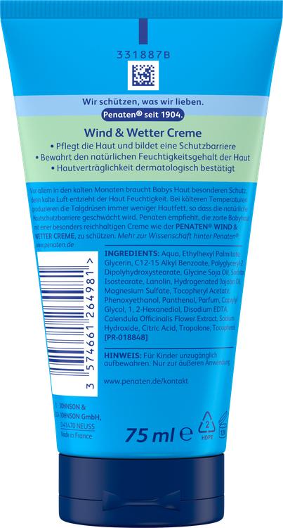 Penaten Wind & Weather Cream är speciellt utvecklad för att skydda barnets känsliga hud mot kalla och fuktiga väderförhållanden. Den rika formulan med värdefullt ringblommeextrakt ger inte bara intensiv vård, utan bildar också en skyddande barriär som bevarar hudens naturliga fuktinnehåll. Det är särskilt viktigt att skydda spädbarns känsliga hud under de kalla månaderna, eftersom den kan förlora fukt på grund av de låga temperaturerna och den torra luften. Dermatologiskt testad hudkompatibilitet säkerställer att krämen är skonsam mot huden och är idealisk för daglig användning.