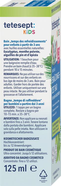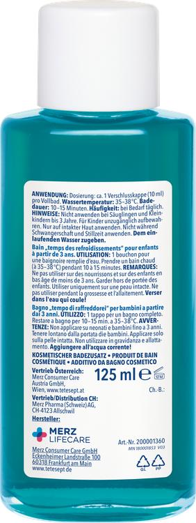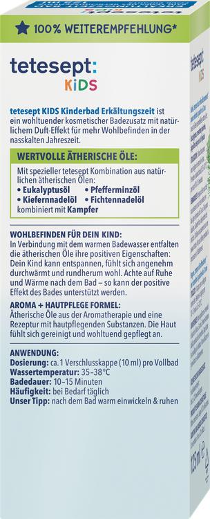 Tetesept KIDS Children's Bath Cold Time är speciellt utvecklad för barns behov under den kalla och våta årstiden. Denna lugnande badtillsats kombinerar värdefulla naturliga eteriska oljor, inklusive eukalyptusolja, pepparmyntsolja, tallbarrsolja och granbarrsolja, med kamfer för att utveckla de positiva egenskaperna i det varma badvattnet. Den milda och hudvänliga formulan ser till att ditt barn kan slappna av, känner sig behagligt varm och har det helt bekvämt. Idealisk för en allsidig känsla av välbefinnande som stöder välbefinnandet och kan främja blodcirkulationen.