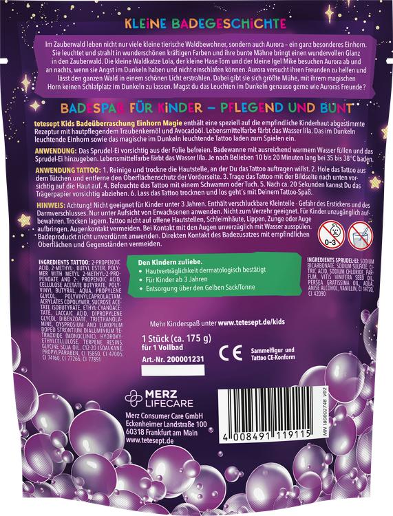 Upptäck den magiska världen av bad med Tetesept KIDS Bath Surprise Unicorn Magic! Detta bubblande äventyr förvandlar varje bad till en fantastisk upplevelse. Formulan, som är speciellt utvecklad för barns känsliga hud, innehåller närande druvkärneolja och avokadoolja för att varsamt rengöra och skämma bort huden. Badvattnet färgas i en livfull lila färg, medan den självlysande enhörningen och den magiska tatueringen inbjuder till lek och samlande. Varje badupplevelse ger möjlighet att upptäcka en av totalt sex självlysande enhörningar, vilket gör badupplevelsen ännu mer spännande. Låt ditt barn fördjupa sig i en värld av fantasi och glädje samtidigt som det njuter av fördelarna med en mild, hudvänlig formula.
