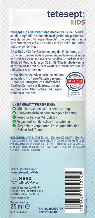 Tetesept Kids Hautwohl Bad Med har utvecklats speciellt för behoven hos känslig barnhud. Den doftfria formulan med värdefulla vårdande oljor ger en skonsam rengöring och är idealisk för barn från ett års ålder. Badtillsatsen är särskilt lämplig för torr hud och hud som är benägen för neurodermatit och ger en avkopplande och lugnande badupplevelse som vårdar och skyddar huden. Den milda formulan stärker hudens barriär och gör att barnen kan koppla av i ett lugnande bad.