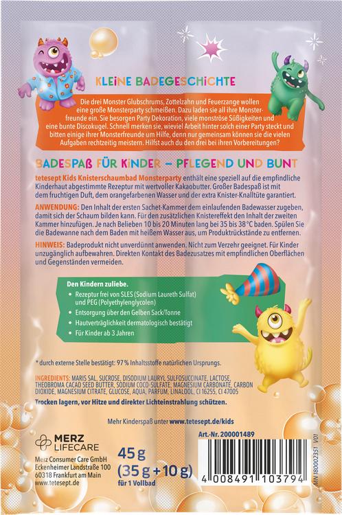 Tetesept KIDS bubbelbad Knister Monster Party förvandlar varje bad till ett spännande äventyr! Med sin fruktiga doft och ljusa orange färg ger det oförglömliga badstunder. Det första steget ger en skummande badupplevelse, medan den speciella crackle boostern ger ytterligare överraskningar och ger vattnet liv. Formulan, som är speciellt utvecklad för barns känsliga hud med hudvårdande kakaosmör, rengör skonsamt och vårdar huden på samma gång. Upplev glädjen av att bada tillsammans med ditt barn med detta unika bubbelbad som inte bara rengör utan också ger massor av skoj.
