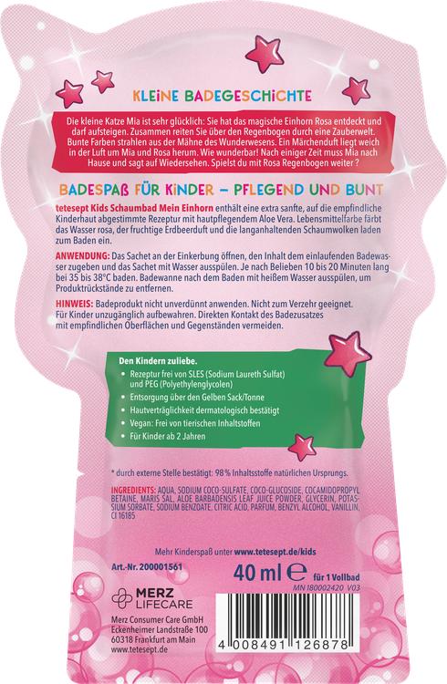 Tetesept KIDS bubbelbad "My unicorn" är den perfekta badglädjen för dina små. Med en speciellt framtagen formula för barns känsliga hud ger detta bubbelbad en skonsam och hudvårdande badupplevelse. Berikad med hudvårdande aloe vera och mandelproteiner ger den optimalt skydd och vård. Den fruktiga jordgubbsdoften och den ofarliga livsmedelsfärgen, som gör vattnet magiskt rosa, gör badandet till en glädjefylld upplevelse. Badvattnet ger inga fläckar på hud, hår eller i badkaret. En särskild höjdpunkt är den roliga enhörningsformade fingerdockan, som gör det ännu mer spännande att leka i badet. Skumbadets hudkompatibilitet har bekräftats dermatologiskt och det är lämpligt för barn från 3 år och uppåt.