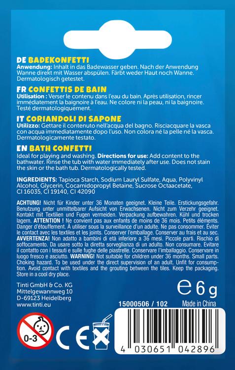 Badet blir en färgstark upplevelse med Tinti badkonfetti! Dessa roliga, färgglada konfettifigurer flyter på vattenytan och ger massor av skoj när du leker och tvålar in dig. Produkten har utvecklats speciellt för barns känsliga hud och innehåller endast noggrant utvalda ingredienser som har testats dermatologiskt för sin hudkompatibilitet, även för känslig hud. Dessutom fläckar badkonfettin inte huden eller badkaret, så att bekymmersfri badning är möjlig. Användningen av livsmedelsfärger gör upptäckten av färger till ett spännande äventyr. För optimalt badglädje rekommenderar vi att du strör en dospåse i vatten med en temperatur på cirka 35-38 °C, helst i ett halvfullt badkar med cirka 70 liter vatten. Efter badet kan badkaret helt enkelt sköljas med varmt vatten.