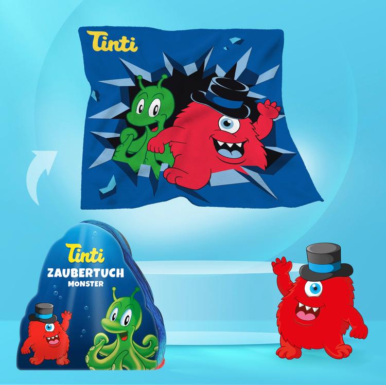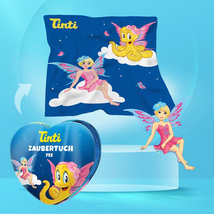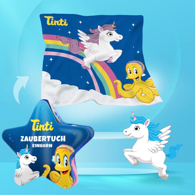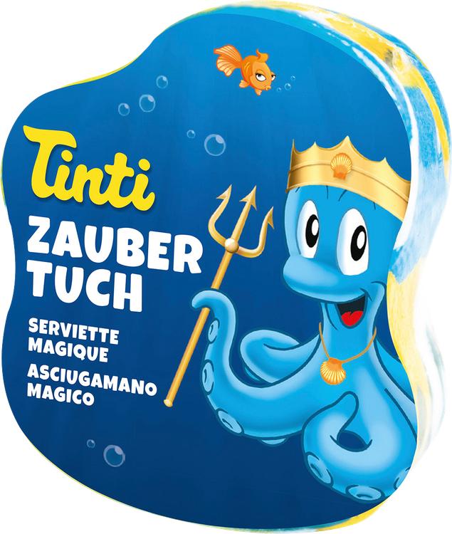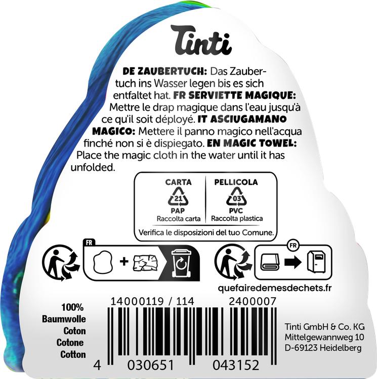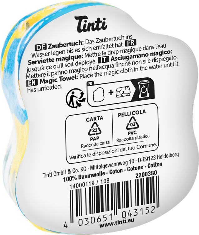 Upptäck den magiska handduken Tinti magic towel! Denna fluffiga handduk med ett glatt Tinti-motiv vecklar ut sig på ett magiskt sätt så snart den läggs i varmt badvatten. Den mjuka velourhandduken är jätterolig att tvätta och passar perfekt för små händer. Den är inte bara en fantastisk present till barn, utan också en underbar följeslagare i badet. Handduken är återanvändbar, maskintvättbar och tillverkad av 100% bomull. Observera att Tinti magic handduk finns i olika utföranden, men att det inte är möjligt att göra ett förval. Även lämplig för barn under 3 år.