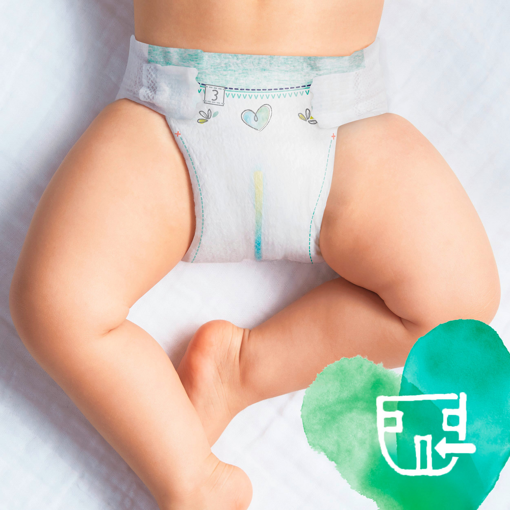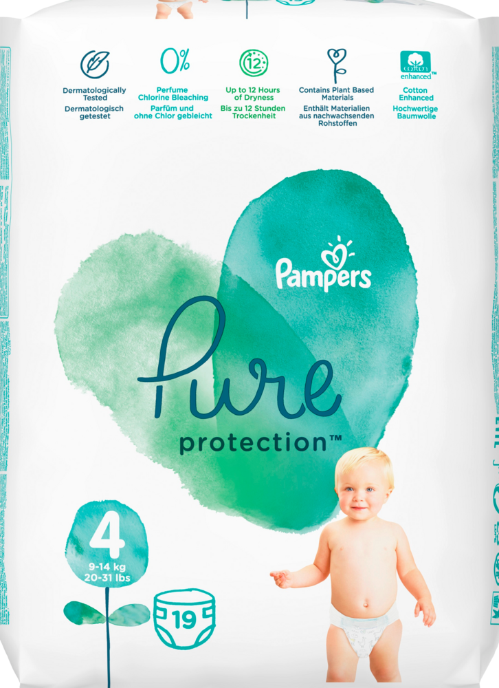 Pampers blöjor håller upp till 12 timmars Pampers-torrhet. Tillverkat med 100% förnybar energi. Med moderna designer och Pampers urinindikator. Pampers Pure Protection blöjor storlek 4 (9-14 kg) hjälper till att skydda den känsliga babyhuden. De är tillverkade av material som innehåller högkvalitativ bomull och andra växtbaserade material. De innehåller 0% parfym eller latex (latex från naturgummi) och är klorfria. De garanterar 100% Pampers-torrhet i upp till 12 timmar. De är dermatologiskt testade, har moderna designer och en användbar urinindikator. Blöjorna tillverkas med 100% förnybar energi och ansvarsfullt producerad fluffcellulosa.