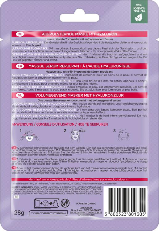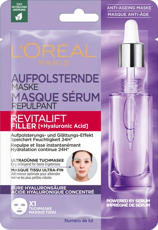 Upplev intensiv hudvård med Revitalift Filler sheet mask från L'Oréal Paris. Denna innovativa mask är berikad med koncentrerad hyaluronsyra och är tillverkad av högabsorberande japansk bomull som kan hålla tio gånger sin vikt i fukt. Med en imponerande tjocklek på bara 0,3 millimeter och unik second-skin-teknik fäster masken perfekt på ansiktet och säkerställer optimal fördelning av de värdefulla aktiva ingredienserna. Den återfuktar inte bara huden omedelbart, utan håller den också återfuktad i 24 timmar. Resultatet är en synbart uppfriskad, smidig hud och fylliga ansiktsdrag för en strålande hy.