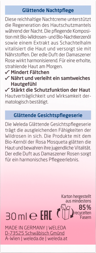 Förser huden med näringsämnen, sammetslen känsla, minskar första rynkor under natten. Stärker hudens skyddsfunktion. Certifierad naturkosmetik. Weledas utjämnande nattkräm är en riklig kräm som är speciellt utvecklad för hudens nattliga regenerationsfas. Med ingredienser som nattljusolja, Sedum Purpureum-extrakt, hästsvans och myrra stödjer den den naturliga regenereringen av hudens försvar och ger intensiv näring. Kräm minskar första tecken på rynkor, bevarar hudens vitalitet och elasticitet och ger en behagligt sammetslen känsla. Den kan appliceras på ansikte, hals och dekolletage och är också lämplig för den känsliga ögonområdet.