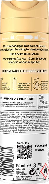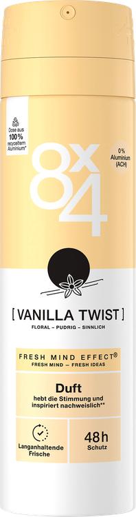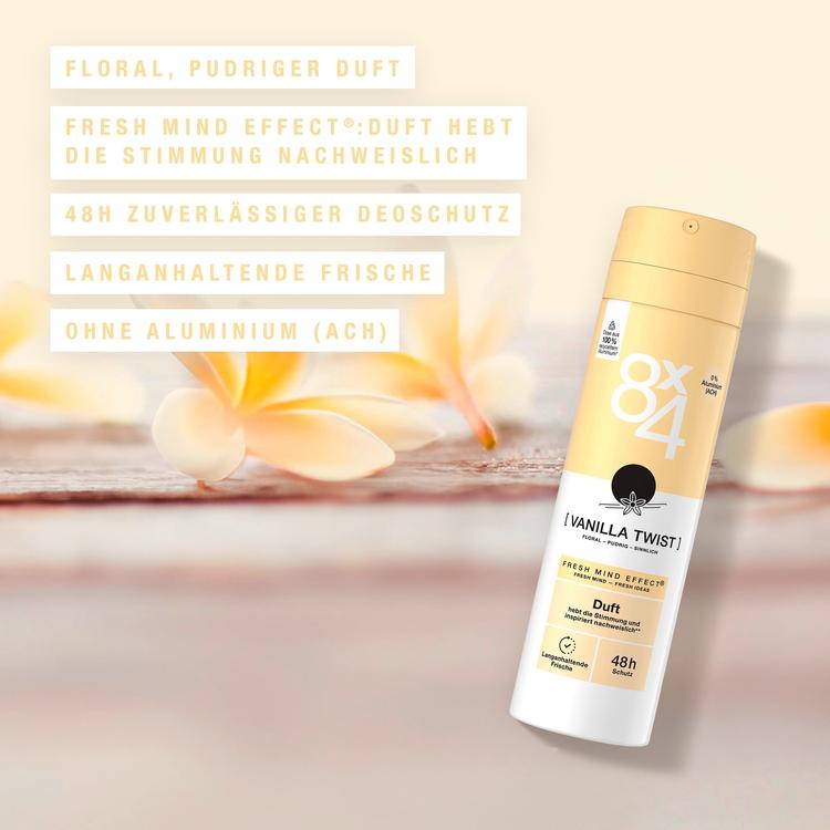 Upptäck den förföriska 8x4 women Vanilla Twist deodorantspray, som stärker sinnena med sin sensuella, blommiga vaniljdoft och ger dig en känsla av friskhet och avkoppling. Oavsett om du har en hektisk dag eller bara vill njuta av en stund av lugn och ro - den här deodoranten är din perfekta följeslagare. Den innovativa Fresh Mind Effect® ser till att du mår bra överallt och lyfter ditt humör. Med ett långvarigt skydd på upp till 48 timmar kan du koncentrera dig på det väsentliga, medan den skonsamma aluminiumfria (ACH) formulan stöder hudens naturliga funktion. Den är dermatologiskt testad och erbjuder inte bara skydd utan också vård för din hud. Unna dig den här lilla pausen och spraya med lycka med 8x4 Vanilla Twist!