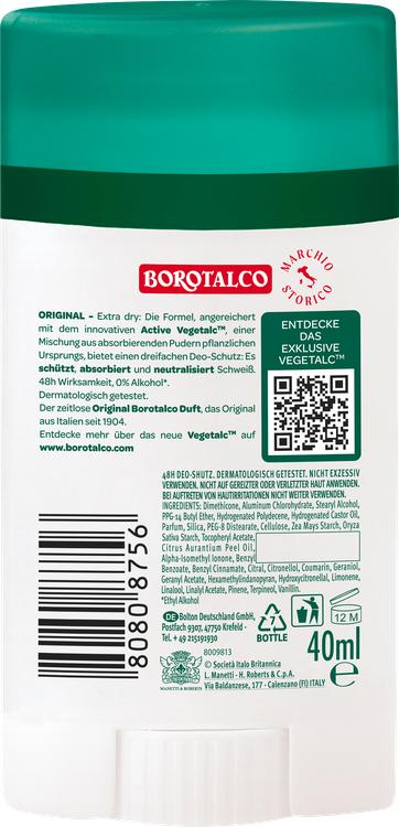 Tack vare den innovativa formuleringen med Active Crystal Talc™ ger Borotalco deodorantstick tredubbelt deodorantskydd och får huden att kännas extra torr. Stickan är utrustad med naturligt talkpulver och garanterar en effektivitet på upp till 48 timmar. Den tidlösa, behagliga doften är perfekt för daglig användning och ger en fräsch känsla. Deodorantstiftet är också alkoholfritt, vilket gör det till ett skonsamt val för huden.