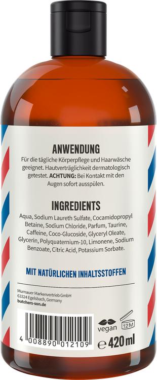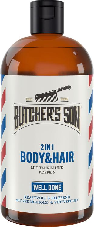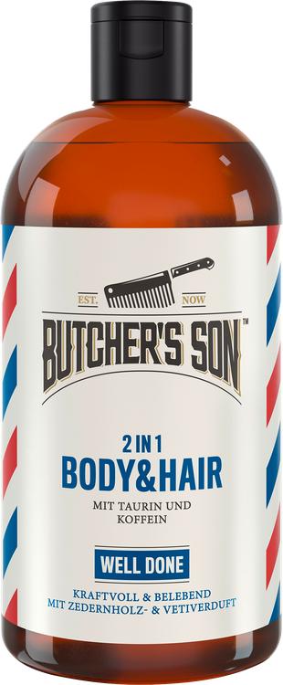 The Butcher's Son 2in1 Body & Hair Shower 'Well Done' kombinerar vård och doft i en unik produkt. Denna mångsidiga dusch är idealisk för den moderna gentlemannen och ger inte bara en uppfriskande rengöring för kropp och hår, utan är också uppfriskande och vitaliserande. Den innovativa formulan innehåller taurin och koffein, som tillsammans stimulerar hårbotten och får håret att skina. Med en långvarig, kraftfull doft som kombinerar de varma tonerna av cederträ, oud och vetiver förvandlar denna dusch din dagliga groomingritual till en lyxig upplevelse. Njut av den svalkande effekten och den förbättrade kambarheten för glänsande hår som ser friskt och levande ut.