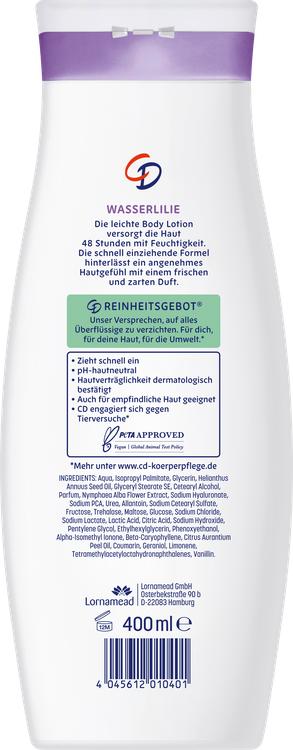 CD Body Lotion Water Lily är en lätt och snabbabsorberande kroppsvårdsprodukt som är speciellt framtagen för normal och torr hud. Den ger huden intensiv fukt i upp till 48 timmar och lämnar en behagligt mjuk känsla. Den fräscha och delikata doften ger en uppfriskande vårdupplevelse. Denna body lotion är även lämplig för känslig hud och erbjuder optimal vård för alla hudtyper.
