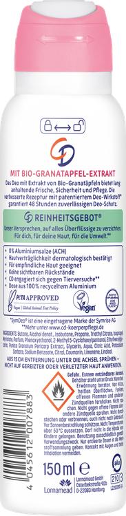 CD Deodorant Spray Organic Pomegranate kombinerar den uppfriskande doften och de närande egenskaperna hos ekologiska granatäpplen från kontrollerad ekologisk odling. Med sin förbättrade formula erbjuder den långvarig fräschör och ger ett tillförlitligt skydd i 24 timmar. Tack vare den patenterade aktiva ingrediensen SymDeo® kan du njuta av en säker känsla utan aluminiumsalter. Deodorantsprayen innehåller endast utvalda ingredienser som är skonsamma mot huden och säkerställer en behaglig känsla av friskhet. Upplev skillnaden med en deodorant som är både effektiv och vårdande.
