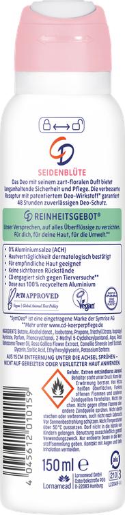 CD deodorantspray Silk Blossom imponerar med sin delikata, blommiga doft och erbjuder långvarigt skydd och vård för huden. Den innovativa formulan med den patenterade aktiva ingrediensen SymDeo® garanterar ett tillförlitligt deodorantskydd i upp till 48 timmar. Särskilt anmärkningsvärd är den aluminiumfria formulan, som är idealisk för känslig hud. Den hudvänliga konsistensen gör att huden känns behaglig och silkeslen, vilket gör deodoranten till den perfekta följeslagaren i vardagen.