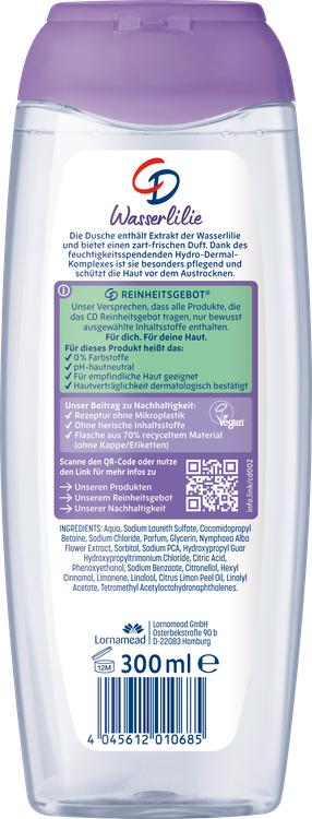CD duschgel med den delikata, fräscha doften av näckros är en riktig njutning för sinnena. Den speciella formulan uppfyller de höga kraven i CD Purity Command, som inte innehåller några överflödiga ingredienser. Med det innovativa hydrodermala fuktgivande komplexet erbjuder denna duschgel inte bara skonsam rengöring utan också intensiv vård som gör huden smidig och mjuk. Den pH-neutrala formulan säkerställer att huden inte torkar ut och en behaglig duschupplevelse garanteras. CD satsar också på hållbarhet: den nya förpackningen med platt lock gör det enkelt att tömma ut eventuella rester så att varje applikation kan användas optimalt. Tack vare den större fyllnadsmängden krävs också färre påfyllningar, vilket minskar plastförbrukningen. Dessutom är flaskan (utan lock) redan tillverkad av 70% återvunnen plast, vilket understryker CD:s miljömedvetenhet.