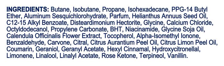 BUTANE, ISOBUTANE, PROPANE, PPG-14 BUTYL ETHER, CYCLOPENTASILOXANE, ALUMINUM SESQUICHLOROHYDRATE, PARFUM, HELIANTHUS ANNUUS SEED OIL, C12-15 ALKYL BENZOATE, DISTEARDIMONIUM HECTORITE, GLYCINE, CALCIUM CHLORIDE, OCTYLDODECANOL, BHT, PROPYLENE CARBONATE, DIMETHICONOL, ALPHA-ISOMETHYL IONONE, BENZYL ALCOHOL, CITRAL, CITRONELLOL, LIMONENE, LINALOOL.
