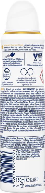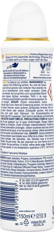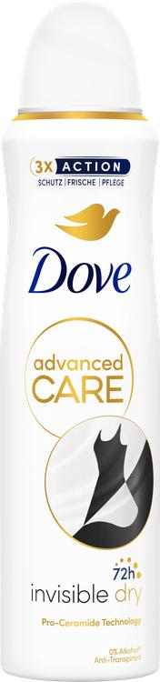 Dove Advanced Care antiperspirant deodorantspray Invisible Dry ger tillförlitligt skydd mot fukt och kroppslukt under armarna i upp till 72 timmar. Med sin innovativa formel, som har testats på 100 färger, minimerar den risken för vita fläckar på kläderna, så att du kan känna dig säker hela tiden. Den inkluderade Skin Hydration Technology säkerställer att den känsliga huden i dina armhålor förblir närd och smidig. Deodoranten är också alkoholfri och har en subtil, fräsch doft med långvarig effekt. Dove använder grymhetsfria produkter och är PETA-vegan-godkänd, så att du inte bara kan känna dig vacker utan också må bra. Perfekt för alla som värdesätter effektivt skydd och hudvård.