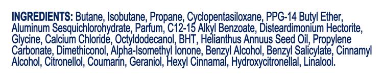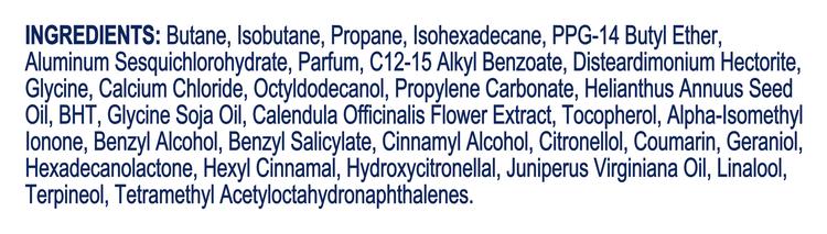 BUTANE, ISOBUTANE, PROPANE, ISOHEXadecane, PPG-14 BUTYL ETHER, ALUMINUM SESQUICHLOROHYDRATE, PARFUM, C12-15 ALKYL BENZOATE, DISTEARDIMONIUM HECTORITE, GLYCINE, CALCIUM CHLORIDE, OCTYLDODECANOL, PROPYLENE CARBONATE, HELIANTHUS ANNUUS SEED OIL, BHT, GLYCINE SOJA OIL, CALENDULA OFFICINALIS FLOWER EXTRACT, TOCOPHEROL, ALPHA-ISOMETHYL IONONE, BENZYL ALCOHOL, BENZYL SALICYLATE, CINNAMYL ALCOHOL, CITRONELLOL, COUMARIN, GERANIOL, HEXADECANOLACTONE, HEXYL CINNAMAL, HYDROXYCITRONELLAL, JUNIPERUS VIRGINIANA OIL, LINALOOL, TERPINEOL, TETRAMETHYL ACETYLOCTAHYDRONAPHTHALENES.