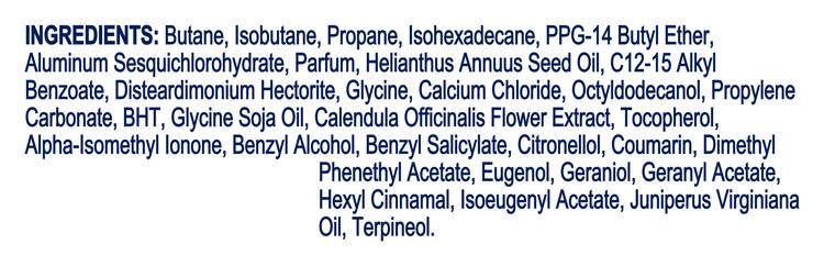 BUTANE, ISOBUTANE, PROPANE, CYCLOPENTASILOXANE, PPG-14 BUTYL ETHER, ALUMINUM SESQUICHLOROHYDRATE, PARFUM, HELIANTHUS ANNUUS SEED OIL, C12-15 ALKYL BENZOATE, DISTEARDIMONIUM HECTORITE, GLYCINE, CALCIUM CHLORIDE, OCTYLDODECANOL, BHT, PROPYLENE CARBONATE, DIMETHICONOL, ALPHA-ISOMETHYL IONONE, BENZYL ALCOHOL, BENZYL SALICYLATE, CITRONELLOL, COUMARIN, EUGENOL, GERANIOL, HEXYL CINNAMAL