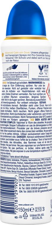 Dove Advanced Care Antiperspirant Deodorant Spray Original ger dig tillförlitligt skydd mot våta underarmar och kroppslukt i upp till 72 timmar. Med sin unika formula, som innehåller den innovativa Skin Hydration Technology, tar den hand om känslig hud under armarna och säkerställer en behaglig, fräsch känsla hela dagen. Deodorantsprayen lämnar en subtil doft och bidrar till smidigheten och mjukheten i underarmshuden. Den är alkoholfri och därför särskilt skonsam mot huden. Dove förlitar sig på djurfria produkter och är PETA-vegan-godkänd, vilket innebär att inga djurförsök utförs under utveckling och produktion. Unna dig den långvariga fräschhetskicken och känslan av välbefinnande som du förtjänar.