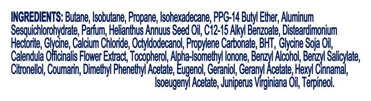 BUTANE, ISOBUTANE, PROPANE, PPG-14 BUTYL ETHER, ISOHEXadecane, ALUMINUM SESQUICHLOROHYDRATE, PARFUM, HELIANTHUS ANNUUS SEED OIL, C12-15 ALKYL BENZOATE, DISTEARDIMONIUM HECTORITE, GLYCINE, CALCIUM CHLORIDE, OCTYLDODECANOL, PROPylene CARBONATE, BHT, GLYCINE SOJA OIL, CALENDULA OFFICINALIS FLOWER EXTRACT, TOCOPHEROL, ALPHA-ISOMETHYL IONONE, BENZYL ALCOHOL, BENZYL SALICYLATE, CITRONELLOL, COUMARIN, DIMETHYL PHENETHYL ACETATE, EUGENOL, GERANIOL, GERANYL ACETATE, HEXYL CINNAMAL, ISOEUGENYL ACETATE, JUNIPERUS VIRGINIANA OIL, TERPINEOL.