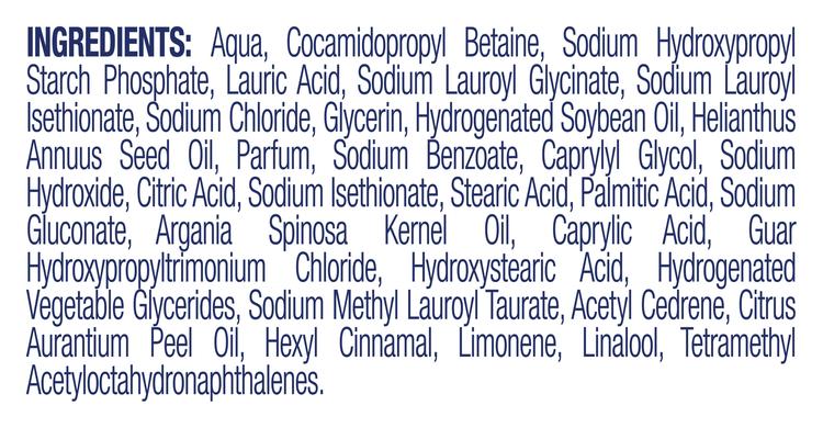 AQUA, COCAMIDOPROPYL BETAINE, SODIUM HYDROXYPROPYL STARCH PHOSPHATE, LAURIC ACID, SODIUM LAUROYL GLYCINATE, SODIUM LAUROYL ISETHIONATE, SODIUM CHLORIDE, GLYCERIN, HYDROGENATED SOYBEAN OIL, HELIANTHUS ANNUUS SEED OIL, PARFUM, SODIUM BENZOATE, CAPRYLYL GLYCOL, SODIUM HYDROXIDE, CITRIC ACID, SODIUM ISETHIONATE, STEARIC ACID, PALMITIC ACID, SODIUM GLUTONATE, ARGANIA SPINOSA KERNEL OIL, CAPRYLIC ACID, GUAR HYDROXYPROPYLTRIMONIUM CHLORIDE, HYDROXYSTEARIC ACID, HYDROGENATED VEGETABLE GLYCERIDES, SODIUM METHYL LAUROYL TAURATE, ACETYL CEDRENE, CITRUS AURANTIUM PEEL OIL, HEXYL CINNAMAL, LIMONENE, LINALOOL, TETRAMETHYL ACETYLOCTAHYDRONAPHTHALENES.