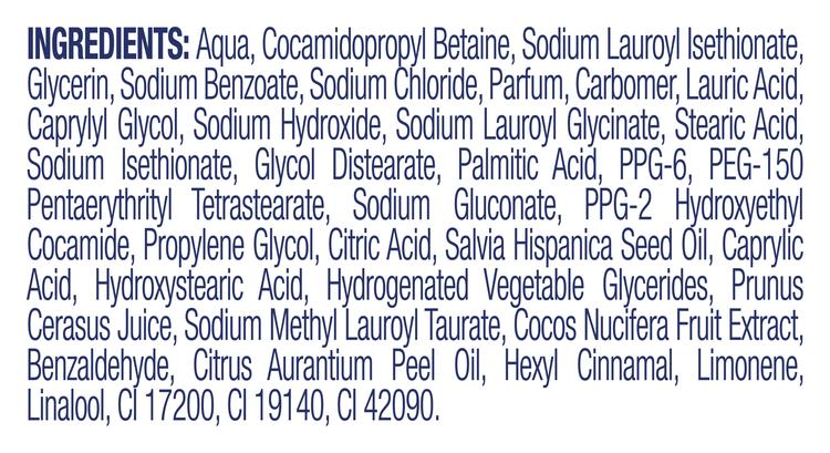 AQUA, COCAMIDOPROPYL BETAINE, SODIUM LAUROYL ISETHIONATE, GLYCERIN, SODIUM BENZOATE, SODIUM CHLORIDE, PARFUM, CARRAGEENAN, LAURIC ACID, CAPRYLYL GLYCOL, SODIUM LAUROYL GLYCINATE, STEARIC ACID, SODIUM ISETHIONATE, GLYCOL DISTEARATE, PALMITIC ACID, PPG-6, SODIUM GLUCONATE, PEG-150 PENTAERYTHRITYL TETRASTEARATE, SODIUM HYDROXIDE, PPG-2 HYDROXYETHYL COCAMIDE, PROPYLENE GLYCOL, CITRIC ACID, SALVIA HISPANICA SEED OIL, CAPRYLIC ACID, HYDROXYSTEARIC ACID, HYDROGENATED VEGETABLE GLYCERIDES, PRUNUS CERASUS JUICE, SODIUM METHYL LAUROYL TAURATE, COCOS NUCIFERA FRUIT EXTRACT, BENZALDEHYDE, CITRUS AURANTIUM PEEL OIL, HEXYL CINNAMAL, LIMONENE, LINALOOL, CI 17200, CI 19140, CI 42090