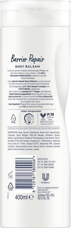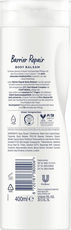Dove Bodylove Barrier Repair Body Balm är den perfekta lösningen för mycket torr och kliande hud. Tack vare en speciell formel som innehåller 22% Skin Repair Complex och panthenol, ger denna balm omedelbar vård och reparerar huden inom bara 7 dagar. Lotionen lindrar stramhetskänslor, lugnar huden och absorberas snabbt så att du omedelbart kan njuta av en behaglig hudkänsla. Med Pro Vitamin B5 stärks hudbarriären och bevarar hudens naturliga fukt. Balmen lämnar huden reparerad och med ett friskt utseende och ger upp till 72 timmars långvarig vård. Den rika konsistensen är dermatologiskt testad och passar perfekt för daglig användning. Massera in krämen i fingertopparna med cirkulära rörelser och upplev en mjuk, strålande hud. För ojämna hudområden ger en extra dos av Dove Barrier Repair Body Balm ytterligare lindring. Dove är engagerad i Body Love och stöder kvinnor i att må bra i sin hud och utveckla sin individuella skönhet.