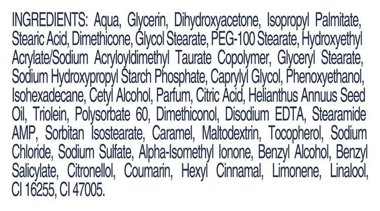 AQUA, GLYCERIN, DIHYDROXYACETONE, ISOPROPYL PALMITATE, STEARIC ACID, DIMETHICONE, GLYCOL STEARATE, PEG-100 STEARATE, HYDROXYETHYL ACRYLATE/SODIUM ACRYLOYL DIMETHYL TAURATE COPOLYMER, GLYCERYL STEARATE, CAPRYLYL GLYCOL, SODIUM HYDROXYPROPYL STARCH PHOSPHATE, PHENOXYETHANOL, ISOHEXadecane, CETYL ALCOHOL, PARFUM, CITRIC ACID, POLYSORBATE 60, DIMETHICONOL, DISODIUM EDTA, STEARAMIDE AMP, SORBITAN ISOSTEARATE, CARAMEL, MALTODEXTRIN, SODIUM CHLORIDE, SODIUM SULFATE, ALPHA-ISOMETHYL IONONE, BENZYL ALCOHOL, BENZYL SALICYLATE, CITRONELLOL, COUMARIN, HEXYL CINNAMAL, LIMONENE, LINALOOL, CI 16255, CI 47005.