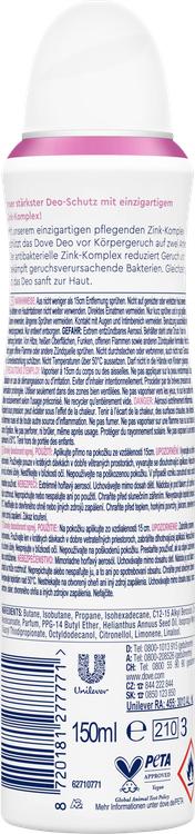 Dove deodorantspray med en elegant rosendoft ger dig inte bara en uppfriskande doft, utan också tillförlitligt skydd mot kroppslukt i upp till 72 timmar. Tack vare det innovativa zinkkomplexet fungerar deodoranten på två sätt: Den minskar obehagliga lukter och bekämpar samtidigt luktframkallande bakterier. Den milda formulan med 1/4 vårdkräm har utvecklats speciellt för behoven hos känslig hud under armarna för att hålla den slät och smidig. Utan aluminiumsalter och alkohol är denna deodorantspray särskilt snäll mot huden. För bästa resultat, applicera deodoranten efter dusch på torr och kyld hud. Håll sprayen upprätt på ett avstånd av 15 cm från armhålorna och spraya i ca 2 sekunder. Dove arbetar för grymhetsfria produkter och är PETA-vegan-godkänd för att ge dig sinnesfrid.