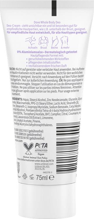 Upptäck Dove Whole Body Deodorant Cream med den lugnande doften av lavendel och kamomill. Denna innovativa deodorantkräm kombinerar effektivt skydd mot kroppslukt med en vårdande formula som är lämplig för hela kroppen. Oavsett om det gäller underarmar, bröst eller ben - krämen är lätt att applicera och ger långvarig fräschör och vård. Den är dermatologiskt testad och speciellt framtagen för känslig hud, men passar även alla hudtyper. Ingredienserna har inte bara en lukthämmande effekt, utan stöder också hudens förnyelse och hjälper till att minska irritation. Den vitaliserande doften säkerställer en behaglig känsla av friskhet hela dagen. Använd helst deodorantkrämen efter duschen för att dra nytta av dess fulla effekt. Dove är också engagerad i djurfria produkter och stöder kvinnor i att utveckla sin individuella skönhet.