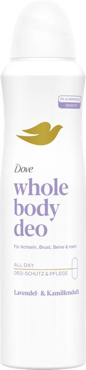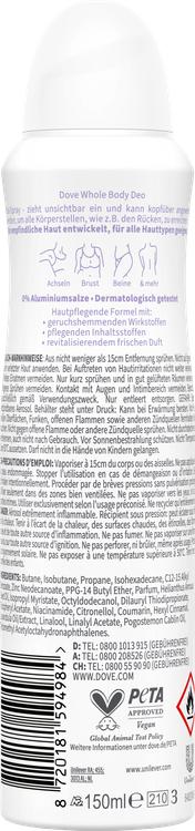 Dove Whole Body Deodorant Spray i den behagliga doftkompositionen av lavendel och kamomill erbjuder en unik kombination av effektivt deodorantskydd och intensiv hudvård för hela kroppen. Med specialutvecklade ingredienser skyddar denna deodorantspray på ett tillförlitligt sätt mot kroppslukt och kan användas på en mängd olika sätt - perfekt för armhålor, bröst, ben och andra delar av kroppen. Den dermatologiskt testade formulan är skonsam mot huden och lämpar sig för alla hudtyper, även känslig hud. Tack vare de hudvårdande komponenterna skyddas huden inte bara från lukter, utan får också stöd och förnyas vid irritation. Den uppfriskande doften ger en behaglig känsla av friskhet och välbefinnande under hela dagen. För att använda, spraya helt enkelt på de önskade områdena på kroppen från ett avstånd av minst 15 cm efter duschen. Dove är stolt över att vara PETA-certifierat och garanterar grymhetsfria produkter som stöder kvinnors individuella skönhets- och hudvårdsbehov.