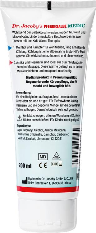 Upptäck den regenererande kroppsvården från Dr. Jacoby, som är känd för sin premiumkvalitet. The Original Horse Ointment Medic erbjuder en effektiv kall- och värmeterapi som specifikt lindrar rygg- och muskelspänningar. Denna speciella salva fungerar i två faser: Först ger den kylande effekten omedelbar lindring, följt av en värmande effekt som främjar blodcirkulationen och får musklerna att slappna av. Perfekt för att lindra ledvärk, trötta muskler och ömma muskler, och håller dig i form och flexibel. Unna dig denna lugnande behandling och känn skillnaden!