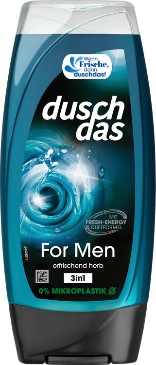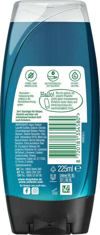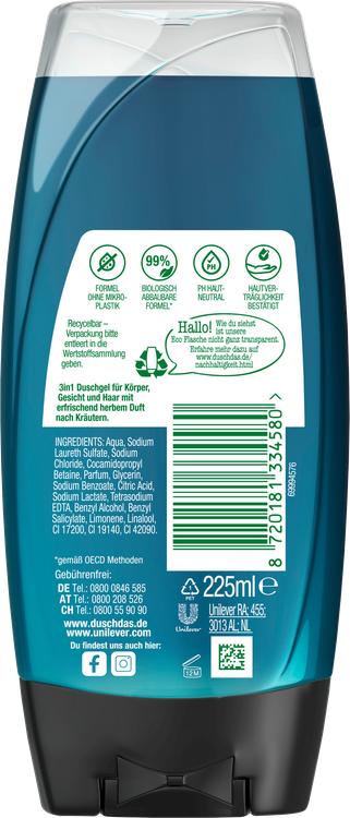 Duschdas 3-in-1 Shower Gel & Shampoo For Men med sin uppfriskande fräscha Fresh Energy-doft är det perfekta valet för aktiva män. Denna mångsidiga vårdformel kombinerar duschgel, schampo och vård för kropp, ansikte och hår i en och samma produkt. Den pH-neutrala formulan är skonsam mot huden och passar perfekt för daglig användning. Den är lätt att dosera, löddrar snabbt och sköljs av lika lätt, så att huden känns fräsch och ren. Duschgelen ger ny kraft och vitalitet och ser till att du får en dynamisk start på dagen. Förpackningen är också hållbart utformad: Flaskan på 225 ml är tillverkad av 100% återvunnen plast och kan också återvinnas helt. Med den beprövade upp-och-ned-formen förblir produkten redo att användas till sista droppen. Upplev en uppfriskande dusch med Duschdas som vitaliserar dig både fysiskt och mentalt och ger dig ny energi inför dagen.