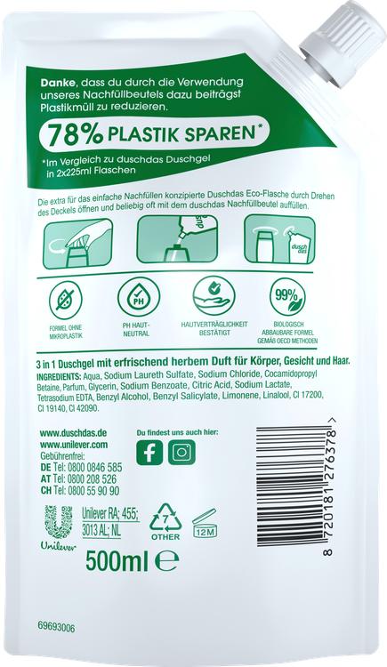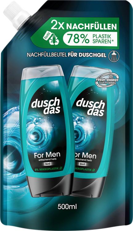 Upptäck Duschdas Shower Gel For Men i en praktisk refillpåse. Denna innovativa 3-i-1 duschgel & schampo är den perfekta uppfriskningen för den moderna mannen och erbjuder en vitaliserande duschupplevelse för kropp, hår och ansikte. Med sin distinkta syrliga citrusdoft ger den en dynamisk start på dagen och håller dig fräsch i upp till 12 timmar. Refillpåsen på 500 ml gör det enkelt att fylla på din duschgelflaska och bidrar till att minska plastavfallet genom att spara 70 % mindre plast jämfört med traditionella förpackningar. Den hudvänliga, pH-neutrala formulan är dermatologiskt testad, vilket gör den idealisk för daglig användning. Unna dig en fräsch och ren hudkänsla med Duschdas och upplev kombinationen av kvalitet och hållbarhet.