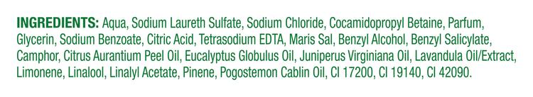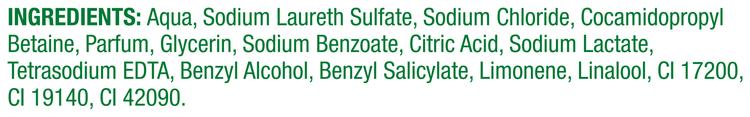 AQUA, SODIUM LAURETH SULFATE, COCAMIDOPROPYL BETAINE, SODIUM CHLORIDE, PARFUM, GLYCERIN, SODIUM BENZOATE, CITRIC ACID, SODIUM LACTATE, TETRASODIUM EDTA, BENZYL ALCOHOL, BENZYL SALICYLATE, LIMONENE, LINALOOL, CI 17200, CI 19140, CI 42090.