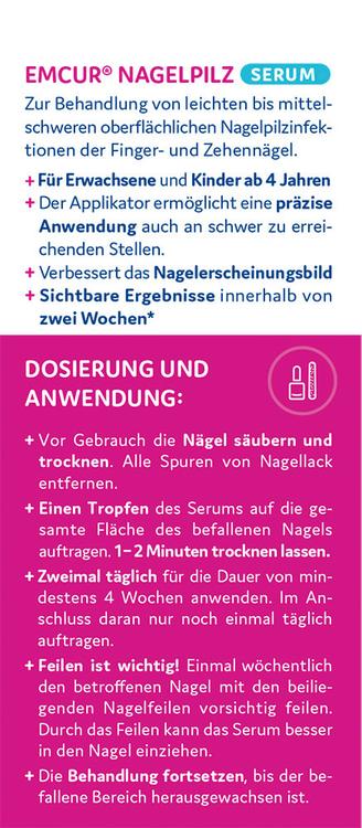 Emcur Nail Fungus Serum är en medicinsk produkt som är speciellt utvecklad för behandling av mild till måttlig ytlig nagelsvamp på finger- och tånaglar. Den innovativa applikatorn möjliggör en exakt och enkel applicering så att du kan behandla de drabbade områdena på ett målinriktat sätt. En behandlingsplan, en nagelmall och 10 nagelfilar ingår också för att hjälpa dig att ta hand om och behandla dina naglar. Kliniska studier bevisar serumets effektivitet, som inte bara lindrar symtomen utan också förhindrar nya infektioner och förbättrar naglarnas utseende. Du kan förvänta dig synliga resultat efter bara två veckor - 92% av deltagarna i en kundundersökning rapporterade en förbättring av nagelytan inom denna period. Serumet är lämpligt för vuxna och barn från 4 år och uppåt.