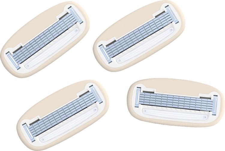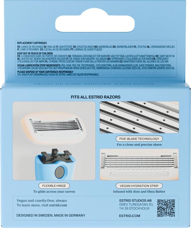 Estrid rakbladsrefill ger dig den perfekta lösningen för en smidig och nära rakning. Med fem superskarpa blad i rostfritt stål garanterar de en enkel applicering som kommer att glädja även dem med känslig hud. Den innovativa veganska smörjremsan, berikad med sheasmör och aloe vera, garanterar inte bara en smidig glidning, utan skyddar också huden från irritation och återfuktar samtidigt. Detta set innehåller fyra rakblad som är kompatibla med alla Estrid rakhyvelhandtag för långvarig fräschör vid varje rakning. Skäm bort din hud och gör rakningen till ett sant nöje.