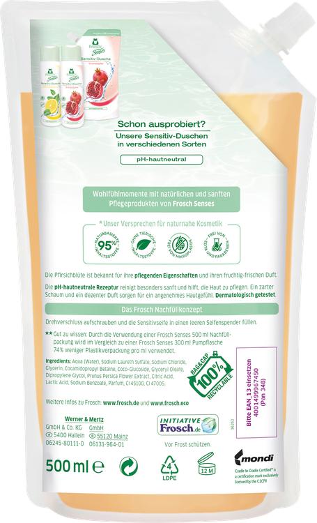 Frosch Pure Care Liquid Soap med den delikata doften av persikoblomma erbjuder mild och hudvänlig rengöring för dina händer. Den är utvecklad med en hypoallergen och pH-neutral formula och skyddar huden från att torka ut varje gång du tvättar händerna. Extraktet från persikoblomman ger inte bara tvålen en fräsch doft, utan ger också lugnande vård. Denna tvål är dermatologiskt testad och innehåller inga mikroplaster, parabener eller animaliska ingredienser. Tack vare den praktiska påfyllningspåsen, som är 100% återvinningsbar, hjälper du till att skydda miljön samtidigt som du rengör dina händer.