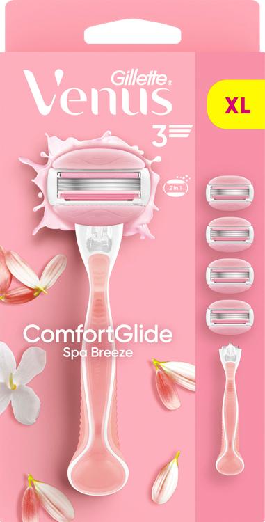 Gillette Venus Comfortglide Spa Breeze rakhyvelset erbjuder en sofistikerad lösning för en smidig och nära rakning. Bladen är speciellt utformade för kvinnor och är utrustade med innovativa 2-i-1 gelkuddar som hjälper till att både löddra och raka. Dessa gelkuddar är berikade med body butter, som avger en uppfriskande doft av vitt te och säkerställer optimalt glid. De tre bladen garanterar en slät rakning och den rörliga designen anpassar sig flexibelt till kroppens konturer. Dessutom skyddar SkinCushion-glidremsan huden från irritation och ger en behaglig känsla under användningen. Det ergonomiska, halkfria handstycket möjliggör exakt kontroll och gör rakningen till en bekväm upplevelse. Perfekt för nybörjare och daglig användning.