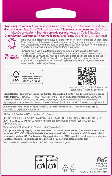 Gillette Venus Extra Smooth Snap rakhyvel är den perfekta lösningen för en nära rakning, speciellt utvecklad för kvinnokroppens behov. Med sin kompakta design och korta handtag är den idealisk för på språng och passar enkelt i alla handväskor eller resväskor. Rakhyveln är utrustad med fem blad med diamanthård beläggning som ger en extremt nära och kontrollerad rakning. Den vattenaktiverade fuktremsan ger inte bara extra skydd mot skador utan bidrar också till en långvarigt slät hud. Den långlivade bladdesignen garanterar tillförlitlig användning så att kvinnor alltid kan falla tillbaka på en effektiv rakhyvel. Ett oumbärligt tillbehör för personlig grooming som alltid finns till hands tack vare den praktiska resestorleken.