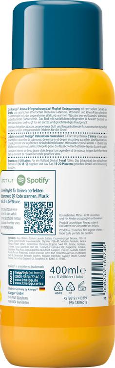 Upplev en lugnande badupplevelse som för kropp och själ i harmoni med Kneipp® Aroma Care Foam Bath Muscle Relaxation. Den speciella formeln kombinerar det värdefulla extraktet av arnica med naturliga eteriska oljor från cabreuva, rosmarin och olika Pinus-arter. I kombination med varmt vatten skapar det en behaglig, värmande känsla som lindrar spänningar och bidrar till avslappning. Badet förhindrar att huden torkar ut och gör att den känns mjuk och smidig. Njut av den intensiva, ljusgula färgen och det långvariga skummet som skämmer bort dina sinnen. Den dermatologiskt bekräftade kompatibiliteten och den milda rengöringen gör denna produkt till ett perfekt val för dina avslappningsritualer. Formulan är också vegansk och fri från mikroplaster, fotogen, silikon och mineraloljor.