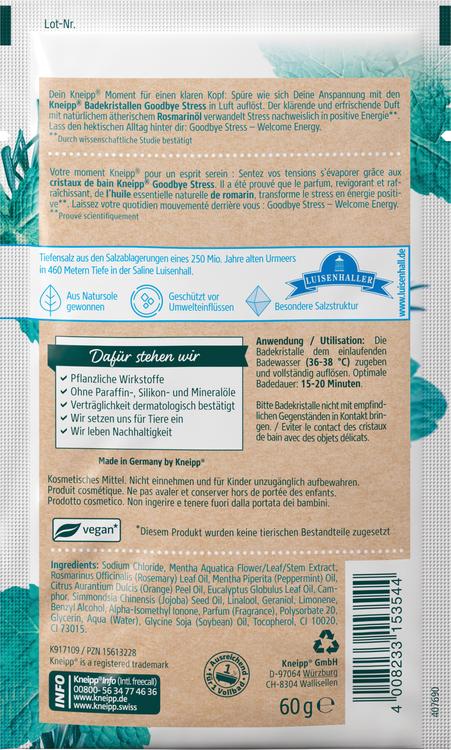 Upplev en avkopplande stund av lugn med Kneipp Goodbye Stress badkristaller. Dessa speciella badkristaller hjälper till att lösa upp din stress och omvandla din spänning till positiv energi. Den uppfriskande doften av naturlig eterisk rosmarinolja och det speciella extraktet av vattenmynta ger dig en behaglig badupplevelse som bevisligen rensar och vitaliserar dina sinnen. Badkristallerna är berikade med naturligt rent termiskt saltlösningssalt från Luisenhalls saltverk och är fria från kemiska tillsatser och miljöpåverkan. Lämna den hektiska vardagen bakom dig och njut av en lugnande time-out som vitaliserar kropp och själ.