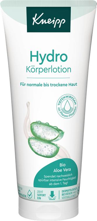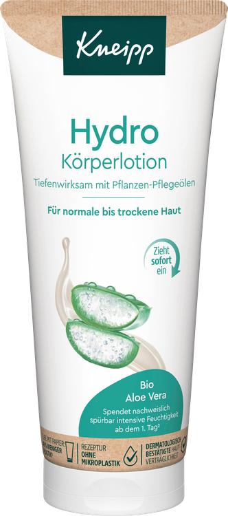 Kneipp Hydro Body Lotion är den perfekta vården för normal till torr hud. Berikad med värdefullt ekologiskt aloe vera-extrakt, ekologisk kokosnötsolja och sheasmör ger denna bodylotion intensiv återfuktning. Den innovativa formulan innehåller ett hydrokomplex och återfuktande panthenol, som lindrar känslan av stramhet i huden under appliceringen. Den lätta konsistensen absorberas snabbt och lämnar huden med en behagligt fräsch och lugnad känsla. Dessutom stöder lotionen hudbarriärens funktion med växtoljor som innehåller hudliknande lipider och därför tränger in i huden optimalt.