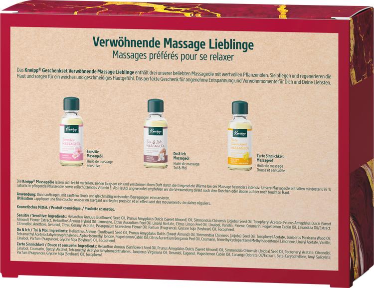 Kneipp Pampering Massage Darlings presentförpackning är det perfekta valet för alla som vill unna sig själva och sina nära och kära avkopplande stunder av välbefinnande. Denna 3-delade uppsättning innehåller tre utvalda massageoljor berikade med högkvalitativa växtoljor. Varje olja ger intensiv näring till huden och gör att den känns underbart mjuk och smidig. Massageoljorna är lätta att sprida, absorberas långsamt och utvecklar sin aromatiska doft särskilt intensivt genom värmen under appliceringen. Oavsett om det är direkt efter duschen eller bara för avkoppling - dessa massageoljor är en njutning för kropp och själ. I setet ingår: 1 x Almond Blossom Gentle Massage Oil (20 ml), 1 x You & Me Massage Oil (20 ml) och 1 x Ylang-Ylang Massage Oil (20 ml). Upptäck naturens kraft för din hud och njut av avkopplande stunder med Kneipp.