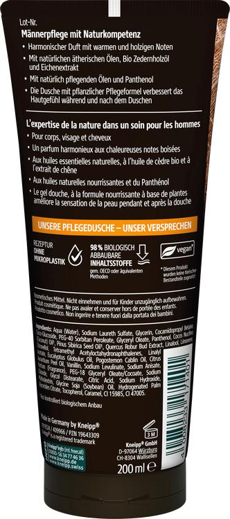 Kneipp Men Shower Gel 3in1 Powerful kombinerar rengöring av kropp, hår och ansikte i en praktisk formula som är idealisk för daglig vård av män. Med en stark, fräsch doft som kombinerar varma och träiga toner säkerställer denna duschgel en harmonisk start på dagen. Berikad med naturliga eteriska oljor, såsom cederträolja och ek-extrakt, samt närande växtoljor och panthenol, förbättrar formulan märkbart hudens känsla under och efter duschen. Den veganska formulan är skonsam mot hudens eget mikrobiom och bevarar hudens naturliga fukt, så att du kan känna dig fräsch och vital hela dagen.